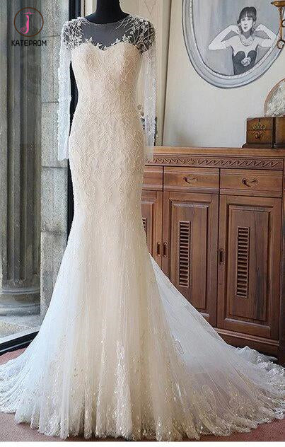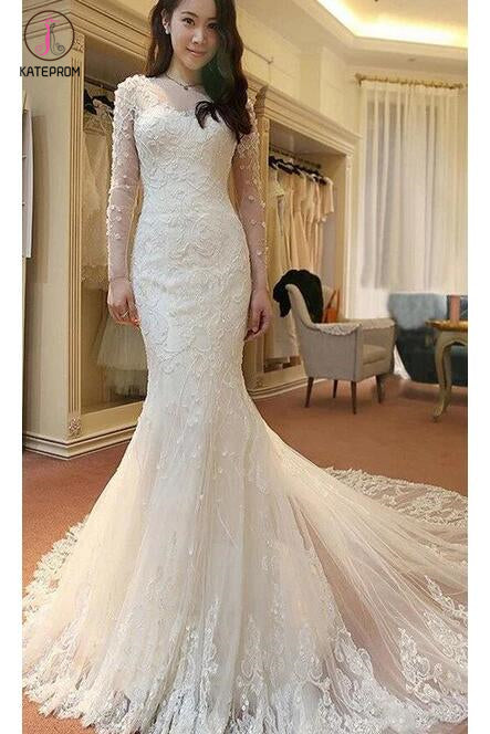 Ivory Long Sleeves Mermaid Lace Appliques Tulle Wedding Dress with Train,Beach Wedding Dress KPW0099