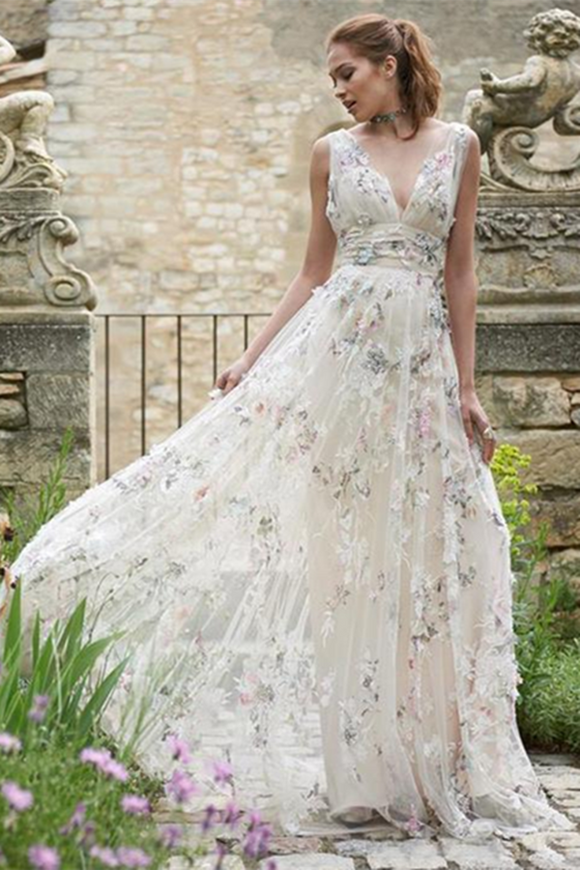 Kateprom A Line V neck 3D Floral Lace Long Prom Dresses Evening Dresses KPP1504