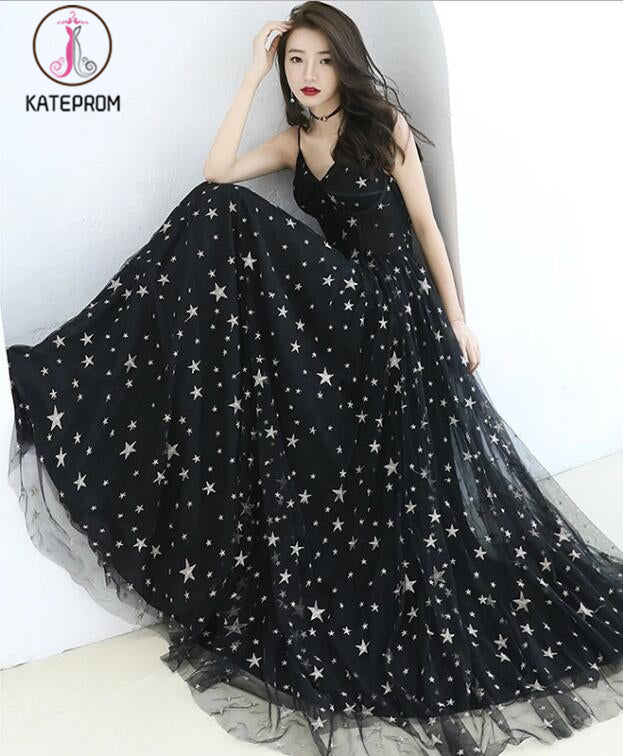 Kateprom Black Spaghetti Straps Tulle Prom Dress with Stars, Floor Length Long Evening Dress KPP1213