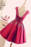 Kateprom Burgundy Satin Ruched Homecoming Dress, A Line Short Prom Dress with Appliques KPH0422