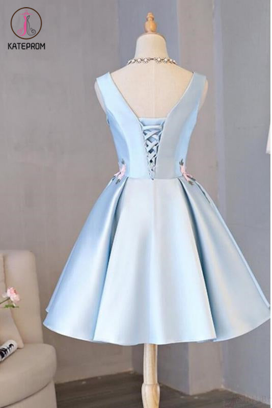 Kateprom Cheap Light Blue Sleeveless Satin Short Prom Dress with Appliques, Homecoming Dress KPH0418