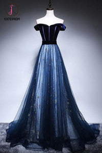 Kateprom Dark Blue Velvet Tulle Long Prom Dress, Elegant Off the Shoulder Evening Dress with Sleeve KPP1232