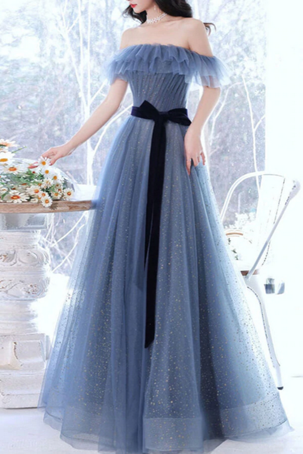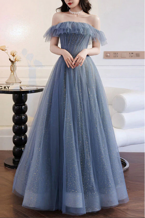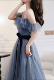 Kateprom Grey Blue Tulle A line Off Shoulder Prom Dresses, Long Formal Dresses KPP1551