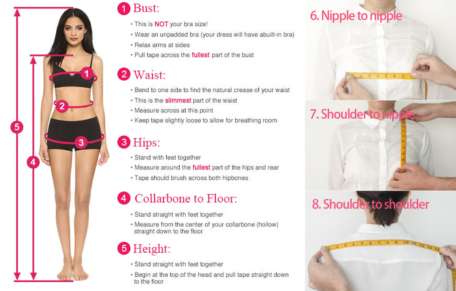 Size Unit: Please refer to the above standard size chart carefully if you choose standard size, to make sure the standard size fit you well. Sizes (bust)/(waist)/(hips)/(Hollow to Floor) are very important.If you need to do custom size, please provide sizes listed below: