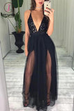 Kateprom Sexy Black Sequins And Tulle Spaghetti Straps Deep V Neck Simple Long Prom Dress KPP1173