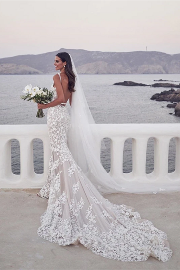 Kateprom Spaghetti Straps Mermaid Wedding Dresses Lace Appliqued Gowns KPW0656