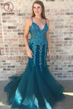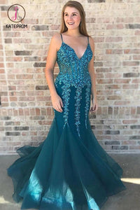 Kateprom Spaghetti Straps Sweep Train Tulle Prom Dress with Beading, Mermaid Dark Green Formal Dress KPP1196
