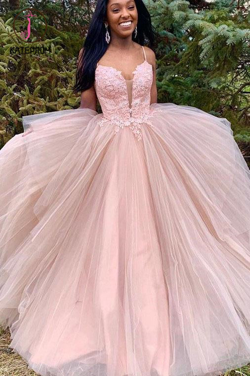 Kateprom Spaghetti Straps Tulle Long Prom Dress with Lace Appliques, New Pink Long Party Dress KPP1155