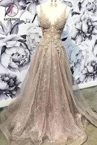 Kateprom Spaghetti Straps V Neck Long Prom Dress with Lace Appliques, Glitter Long Formal Dress KPP1150