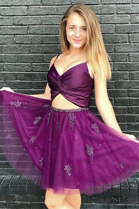 Kateprom Two Pieces Purple Tulle Homecoming Dress with Beadings, Party Dress KPH0579