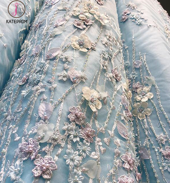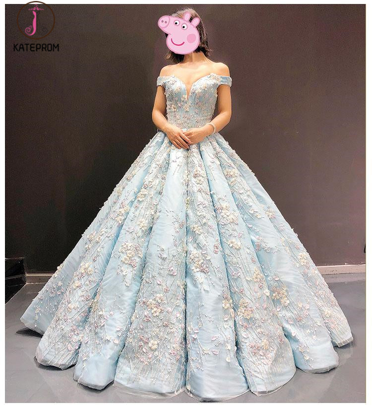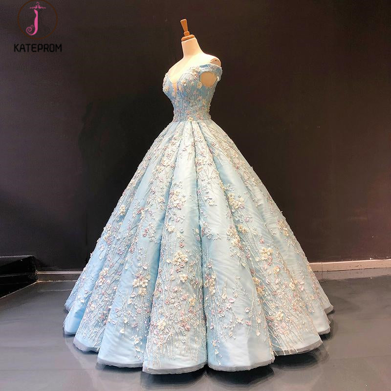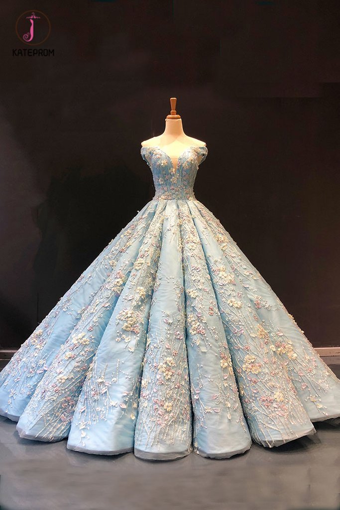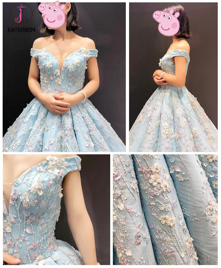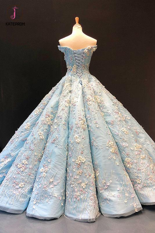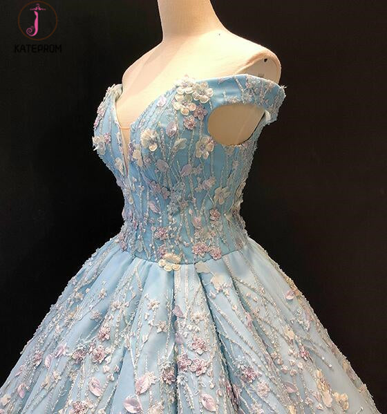 Light Blue Off the Shoulder Ball Gown Quinceanera Dress, Senior Lace Prom Dresses KPP0790