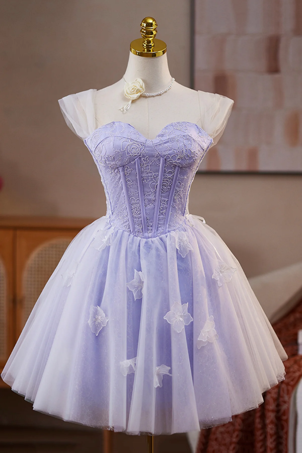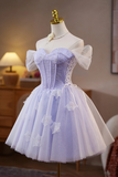 Lilac Lace Off the Shoulder Short Prom Dress, A Line Birthday Party Dress KPH0771