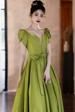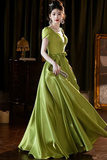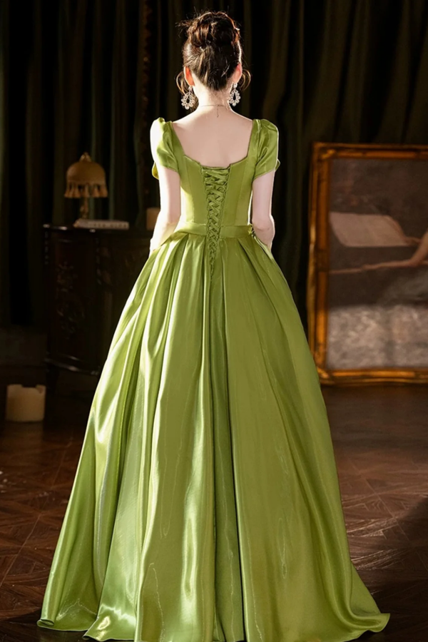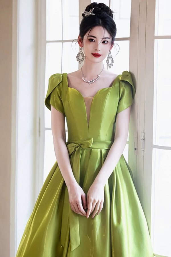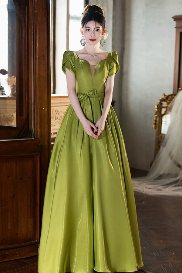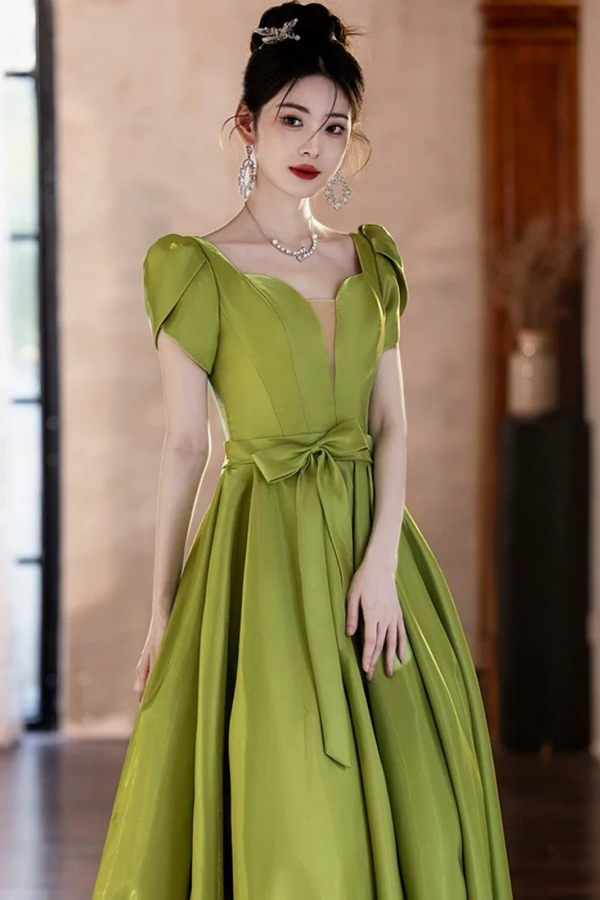 Lovely Green Satin Simple Short Sleeves Party Dress, A Line Prom Dress KPP2091
