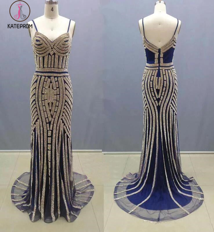 Luxurious Mermaid Spaghetti Straps V-Neck Sparkly Sweep Train Prom Dress,Party Dress KPP0238
