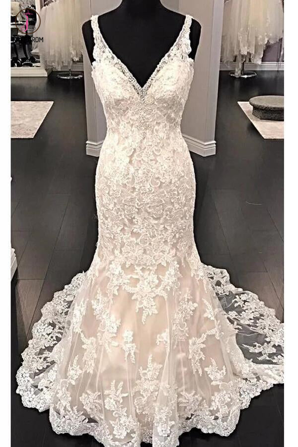 Luxurious V Neck Sleeveless Mermaid Long Lace Wedding Dress, Sweep Train Bridal Dress KPW0201