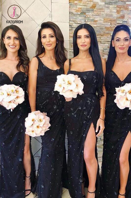 Mismatched Black Mermaid Sexy Slit Beaded Floor-Length Bridesmaid Dresses KPB0152