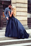 Navy Blue Ball Gown Sweetheart Prom Dress, Princess Satin Strapless Long Prom Gown KPP0809