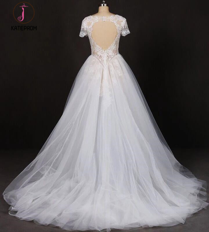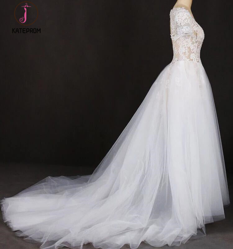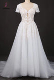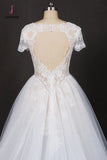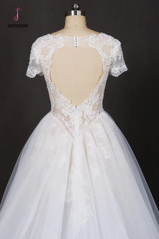 Puffy Short Sleeves Tulle Bridal Dress with Lace Appliques, Long Train Wedding Dress KPW0473