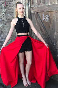 Red and Black A-line Jewel Split Sleeveless Lace Long Prom Dress,Party Dress KPP0332