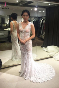 Sexy Ivory V-neck Mermaid Sleeveless Sweep Train Lace Prom Dresses,Cheap Dress KPP0262