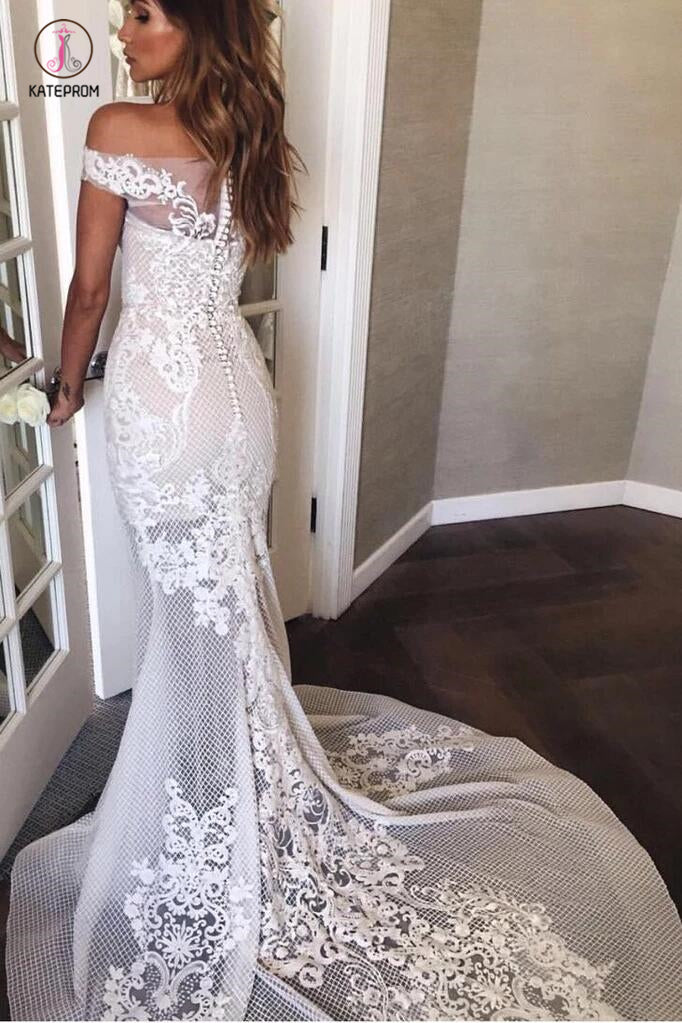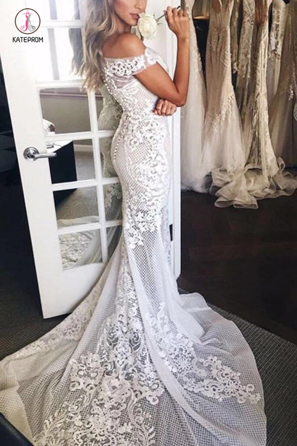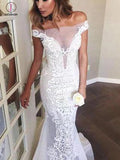 Sexy Mermaid White Off-the-shoulder Sheer Lace Appliques Court Train Beach Wedding Dress KPW0147