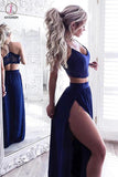 Sexy Two Piece Royal Blue Straps Split V-neck Prom Dresses with Lace,Sexy Long Party Dresses KPP0235