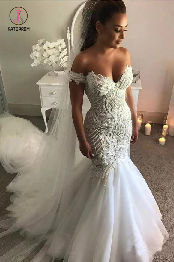 Vintage Off the Shoulder Mermaid Wedding Dress with Appliques, Tulle Bridal Dresses KPW0318