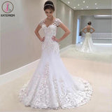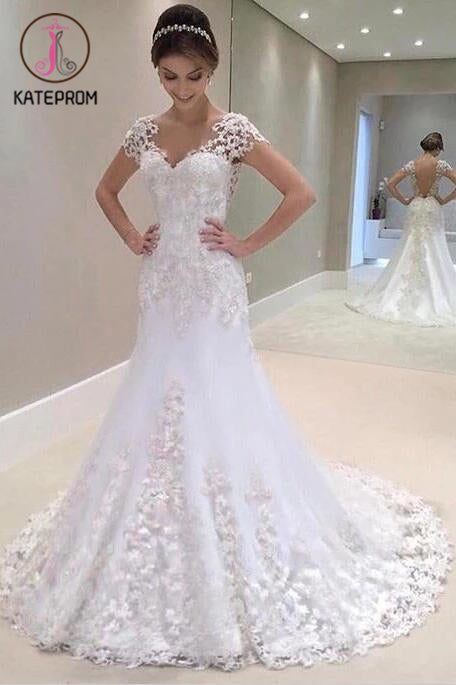 White Appliqued Cap Sleeveless Backless Wedding Dress,Sheath Sweep Train Bridal Dress KPW0058