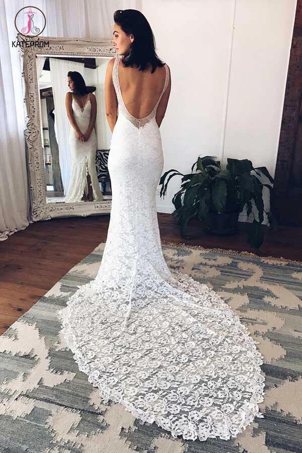 White Mermaid Deep V-Neck Court Train Split Backless Beach Lace Wedding Dress KPW0119