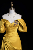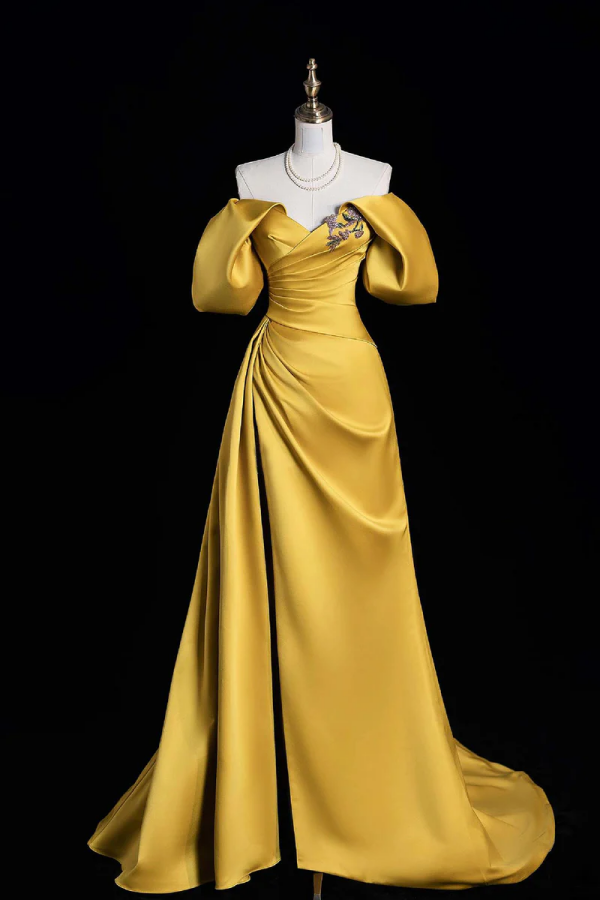 Yellow Satin Long Prom Dress, Off the Shoulder Evening Party Dress with Slit KPP2143