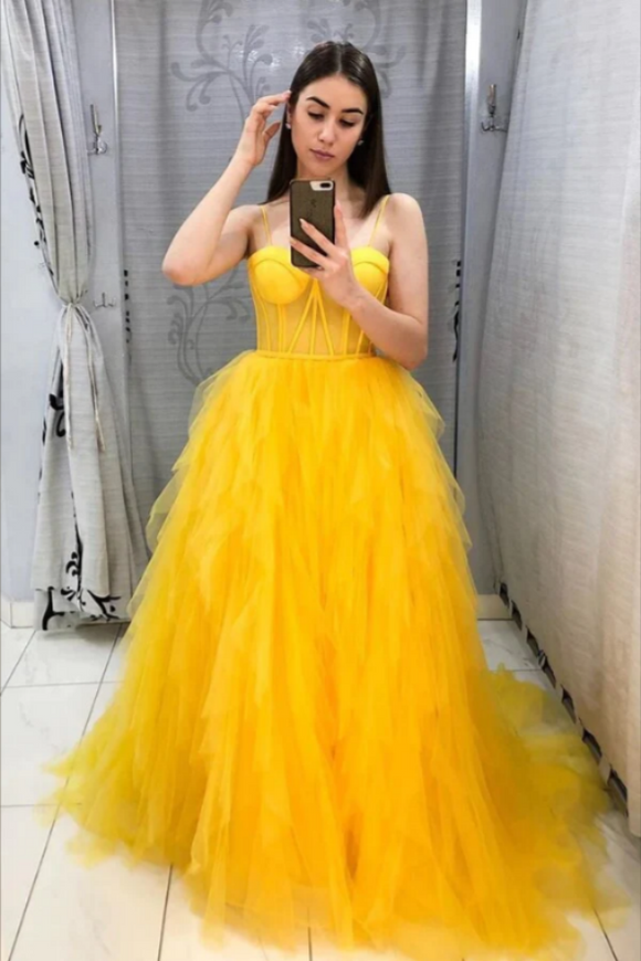 Yellow Tulle A Line Spaghetti Straps Sweetheart Prom Dresses Party Dress KPP1748